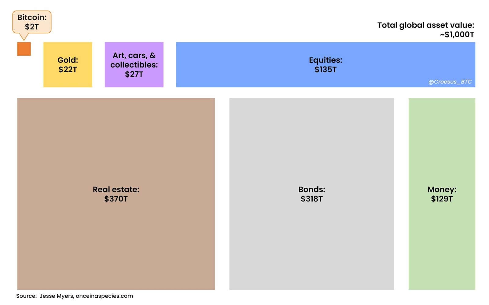 Navzdory tomuto úspěchu zůstává Bitcoin ve srovnání s dalšími třídami aktiv, jako jsou zlato, akcie, nemovitosti a dluhopisy, relativně malý.