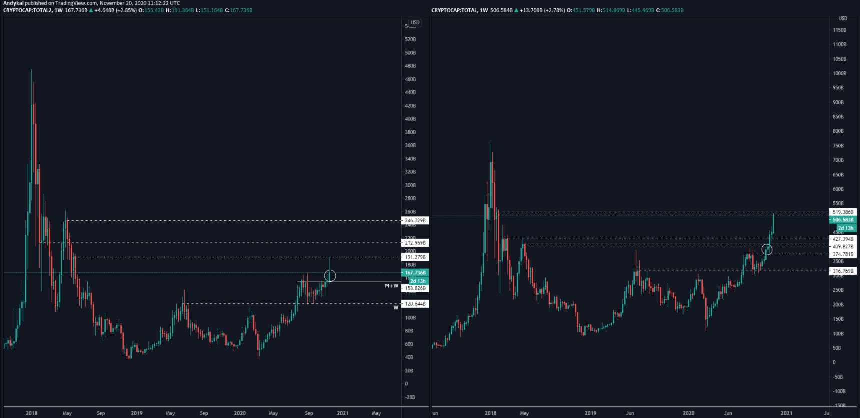 Na dalším obrázku můžete vidět porovnání grafu kapitalizace altcoinů (vlevo) vs celkové kapitalizace trhu kryptoměn (vpravo).
