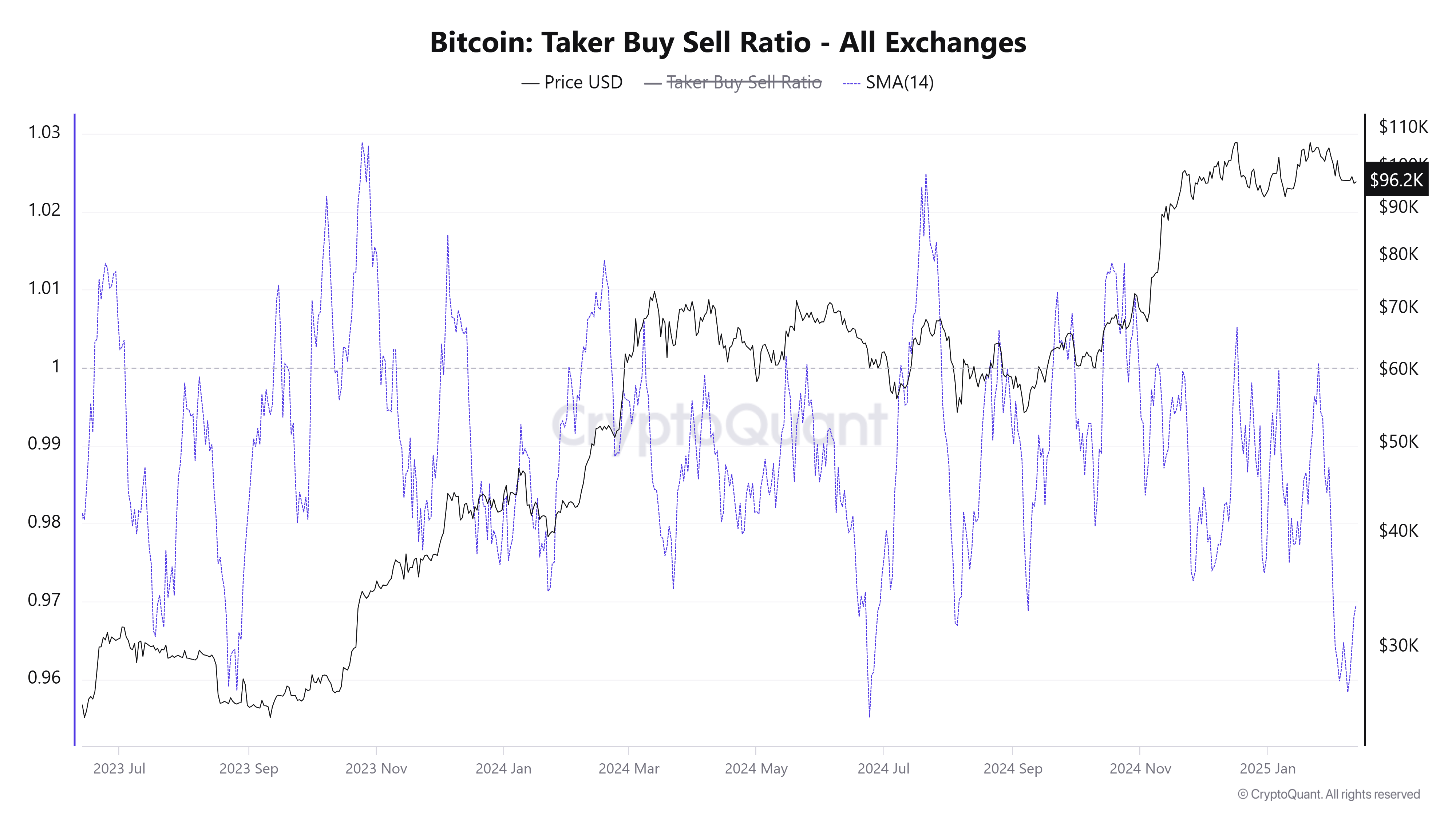 Historicky, když tento klouzavý průměr poměru dosáhl hodnoty 0.96, byli jsme svědky růstu na Bitcoinu. Toto lze na grafu vidět během srpna 2023 nebo června 2024.