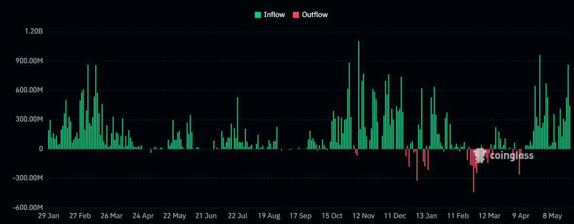 Do konce května zbývá pět obchodních dnů a celkový příliv za tento měsíc dosáhl přibližně 5,39 miliardy dolarů, čímž se trh přiblížil k překonání měsíčního rekordu ve výši 6,49 miliardy dolarů z listopadu 2024.
