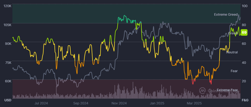 Tento cenový výkyv byl způsoben změnou nálady na trhu, přičemž kryptoměnový index strachu a chamtivosti se aktuálně pohybuje v pásmu chamtivosti se skórem 66 bodů.