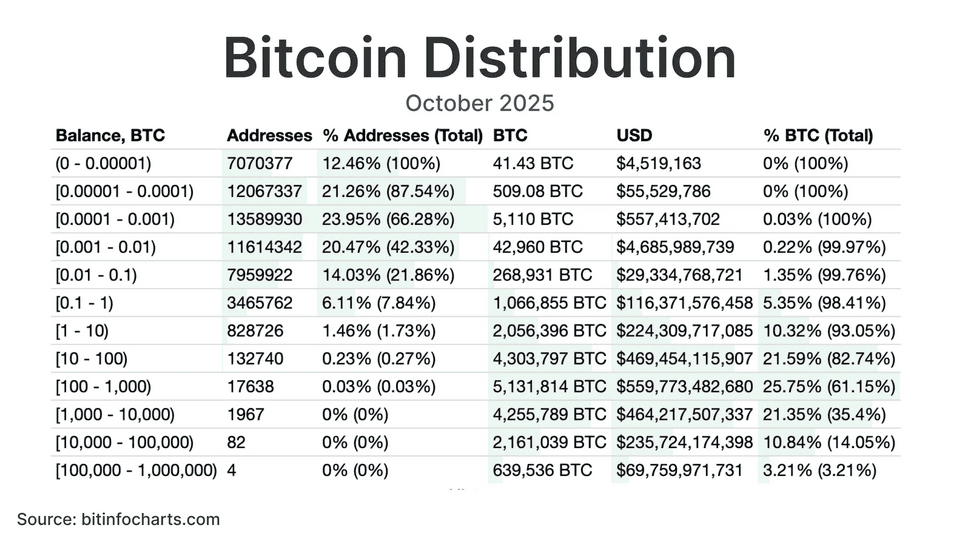 Distribuce Bitcoinu napříč adresami dle velikosti, k říjnu 2025.
