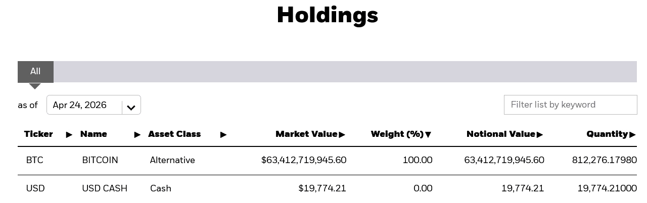 Držby fondu IBIT od iShares v BTC a hotovosti.