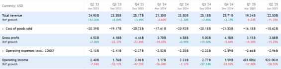 Tržby v Q2 2025 meziročně klesly o 11,8 % a provozní zisk klesl o 58,5 %, což byl třetí meziroční pokles.