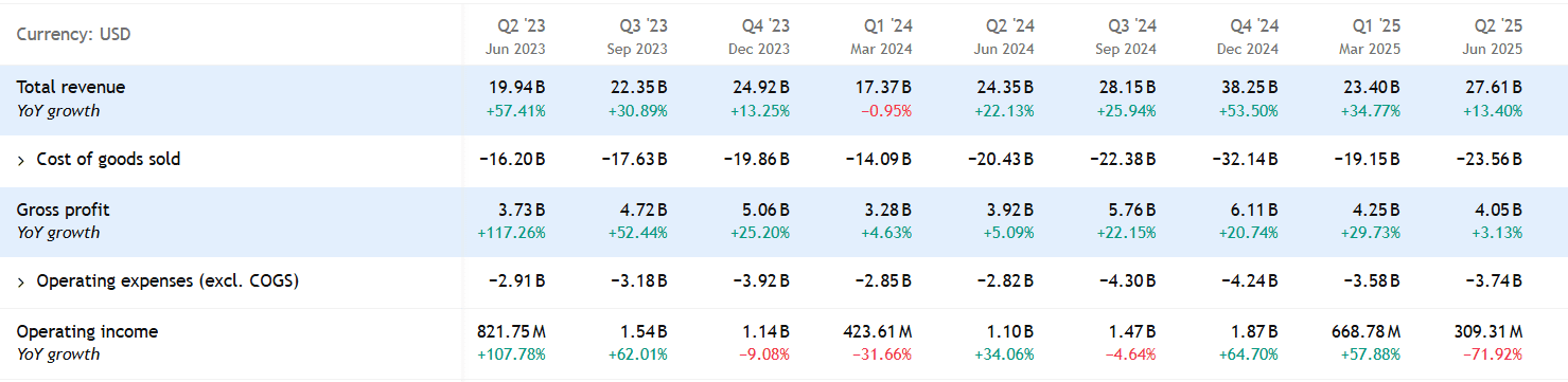 V Q2 2025 tržby meziročně rostly o 13 % a dosáhly 27,6 miliardy USD.