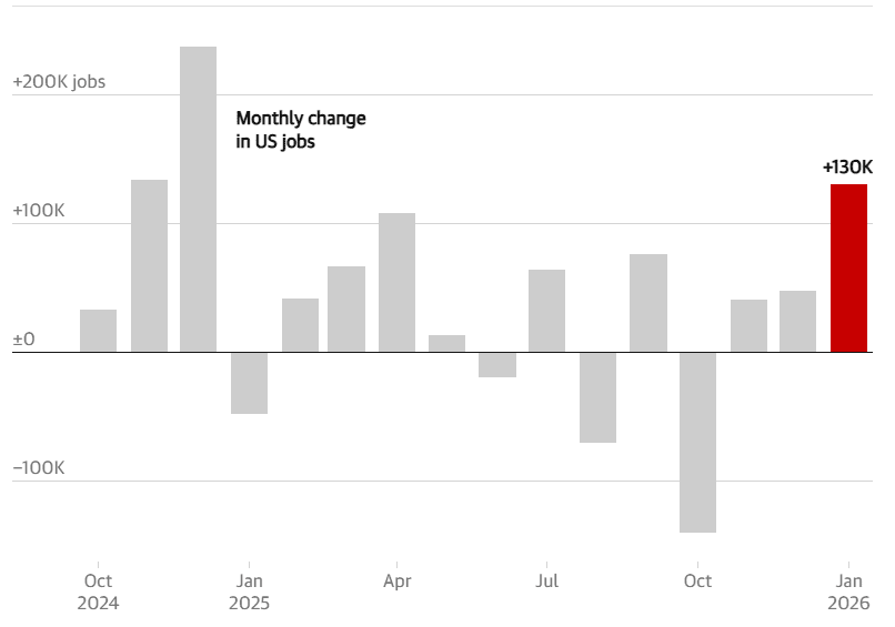 Na rozdíl od prognóz ovlivněných stagnací maloobchodních tržeb v prosinci a nárůstem propouštění v lednu zpráva ukázala, že v prvním měsíci 2026 bylo vytvořeno 130 000 nových pracovních míst a nezaměstnanost klesla na 4,3 %.