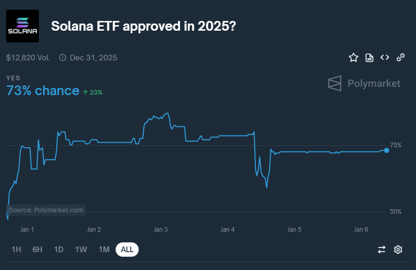 Matthew Sigel, vedoucí analytického oddělení společnosti VanEck, 1. ledna naznačil, že predikce na Polymarketu, která v tu chvíli dávala 77% pravděpodobnost uvedení ETF na Solanu v USA během roku 2025 je konzervativní a šance jsou daleko větší.
