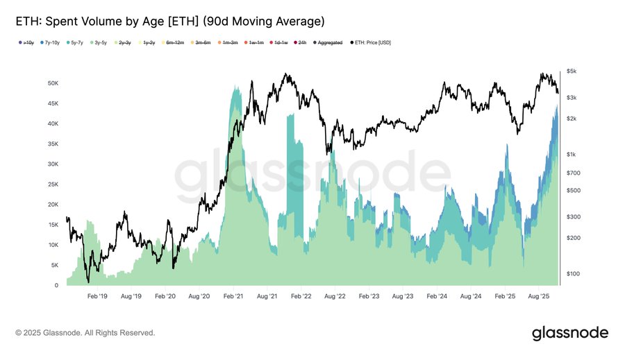 Data od Glassnode ukazují, že prodávali spíše majitelé, kteří mince drží tři až deset let, a to průměrným tempem asi 45 000 ETH denně. Toto nelze nazvat kapitulací, nýbrž řízeným upravováním pozic.