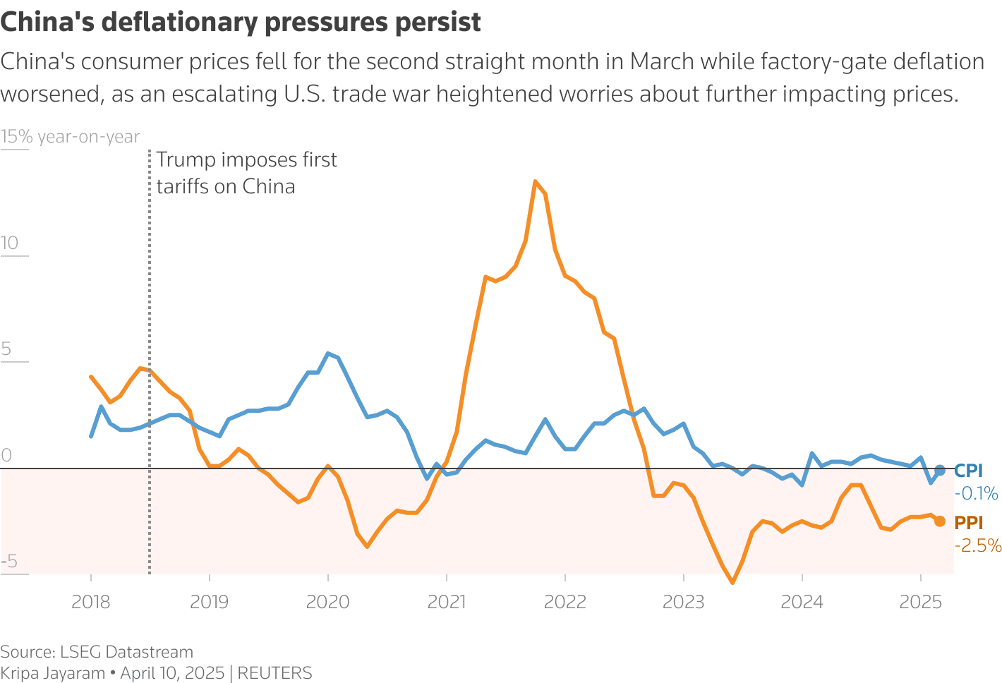 Spotřebitelské ceny (CPI) i průmyslové ceny (PPI) dlouhodobě klesají.