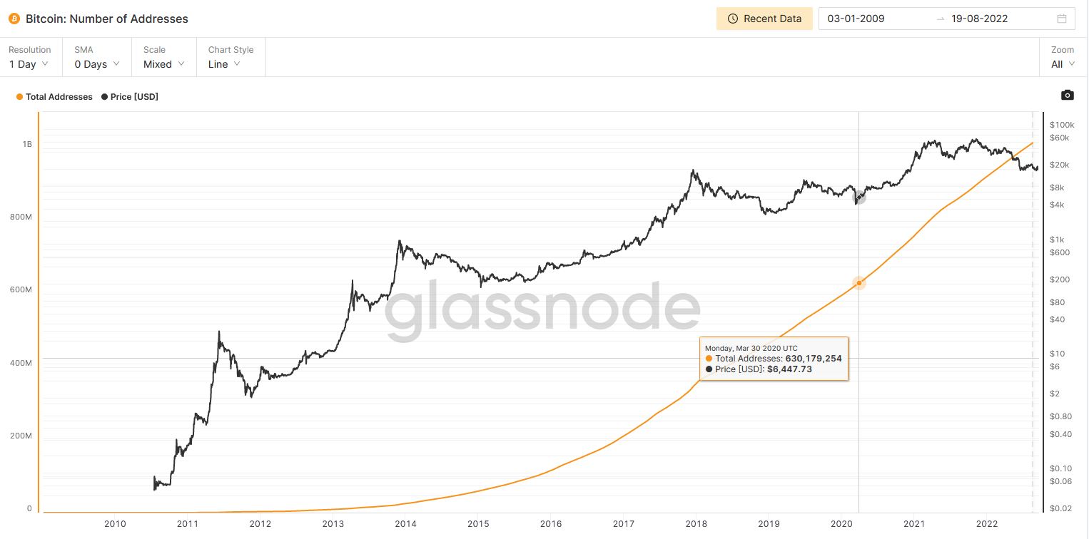 On-chain data ukazují, že v současné době existuje více než jedna miliarda bitcoinových adres. Samozřejmě platí, že lidé mohou mít více než jednu adresu peněženky nebo mohou své bitcoiny uchovávat na centralizovaných burzách, takže je velmi obtížné odhadnout skutečný počet lidí, kteří na světě používají bitcoin.