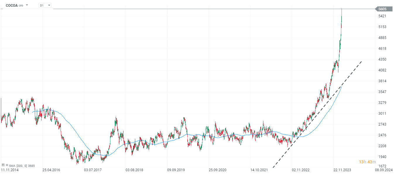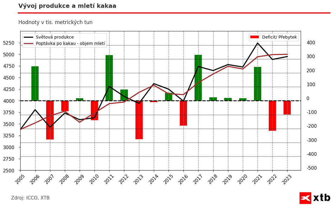 Trh s kakaem je již dva roky v deficitu, což znamená, že poptávka je vyšší než produkce a producenti čerpají ze svých zásob. V letošní sezóně (říjen 2023-září 2024) tomu nebude jinak a předpokládá se ještě výraznější nedostatek. Přístavy na Pobřeží slonoviny hlásí na konci ledna o 36 % nižší objem kakaa a produkce Ghany se v této sezóně odhaduje na 25 % nižší.