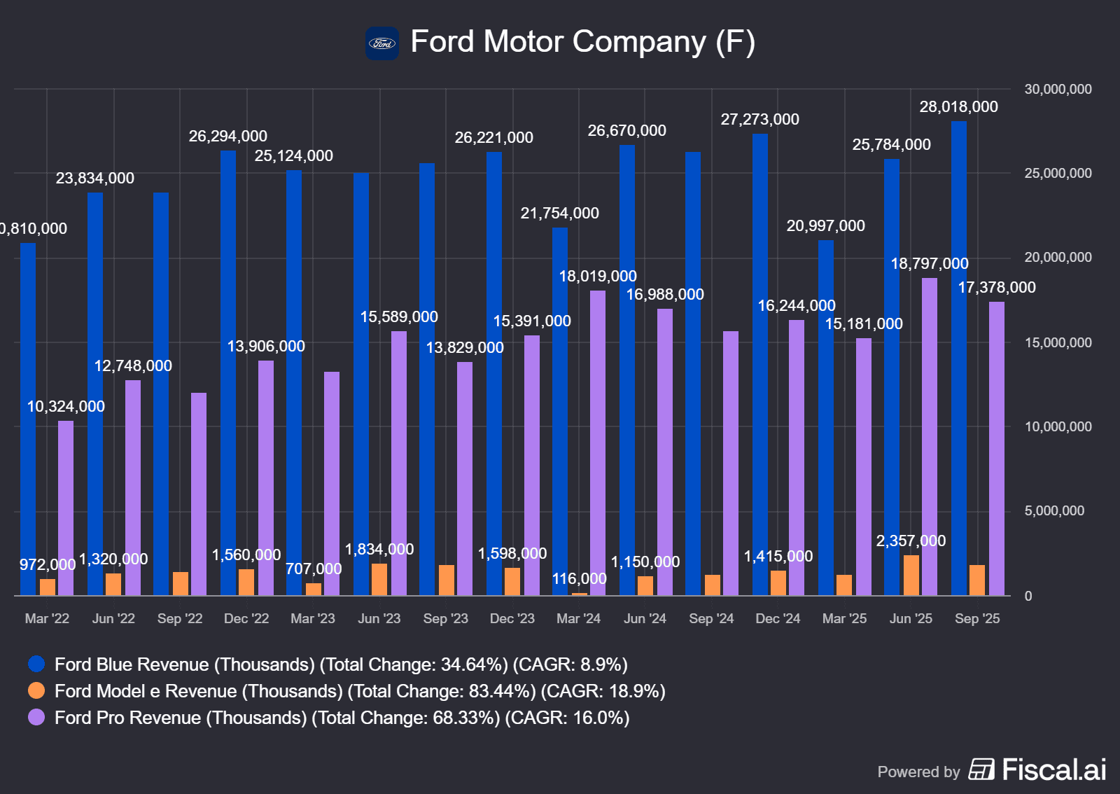 Pak je tu ještě jedna divize, Ford model-e, která ve stejném období vygenerovala ztrátu ve výši 3,6 miliardy dolarů. Ta se zaměřuje na prodeje elektromobilů.