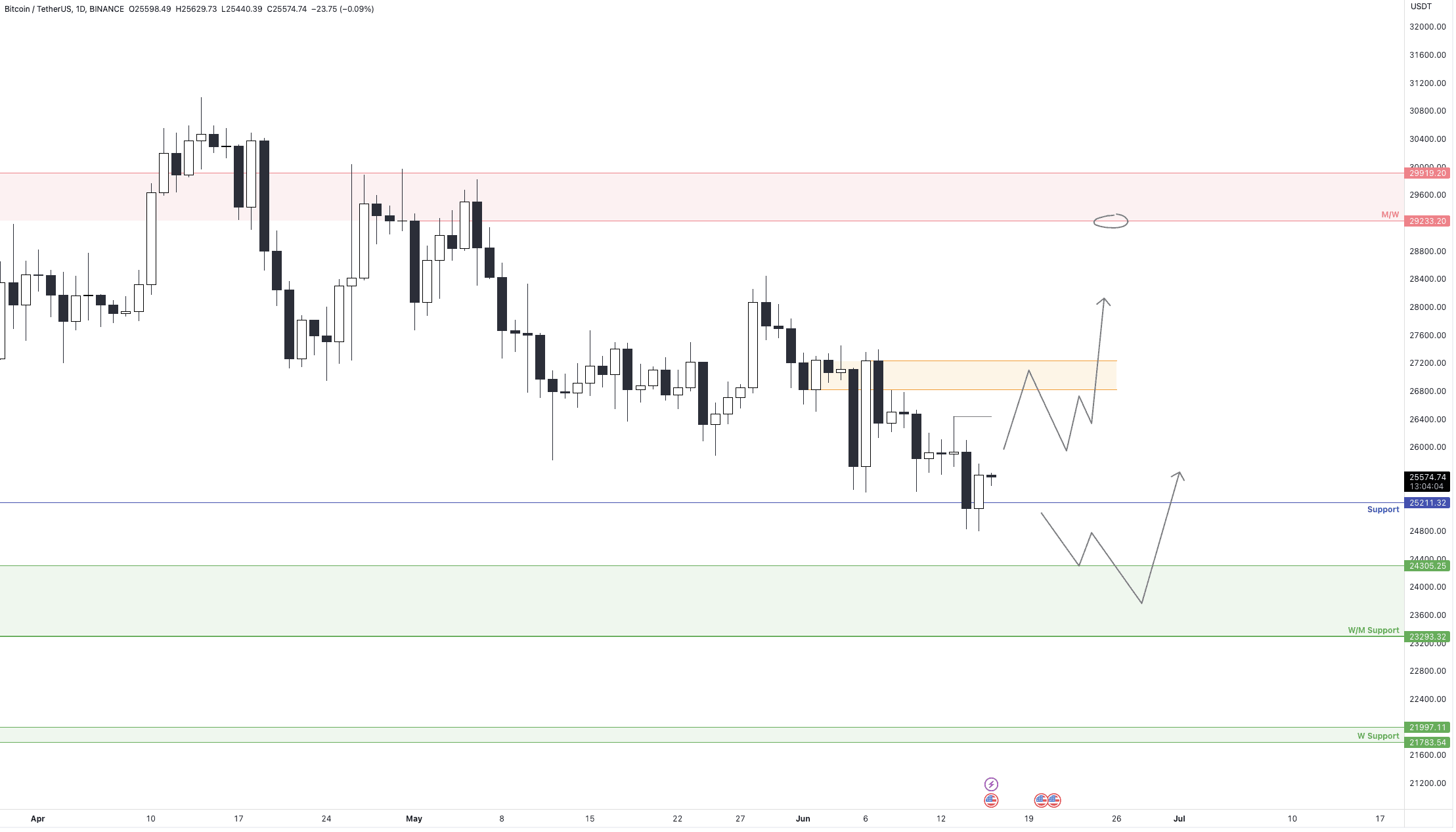 Grafy BTC i ETH jsou na vyšších timeframech nastavené velmi pěkně na pokračování uptrendu. Na denních grafech se ale nacházíme v jeho korekci a stále není jisté, jestli bylo minimum korekce vytvořené – BTC k tomu má nakročeno výrazně lépe než ETH, ale potřebujeme vidět pohyb nad cenovou úroveň 26 400 USD, abychom to mohli potvrdit. Pokud nenastane, měli bychom vidět ještě jednu nohu dolů k návštěvě HTF supportů u obou aktiv.