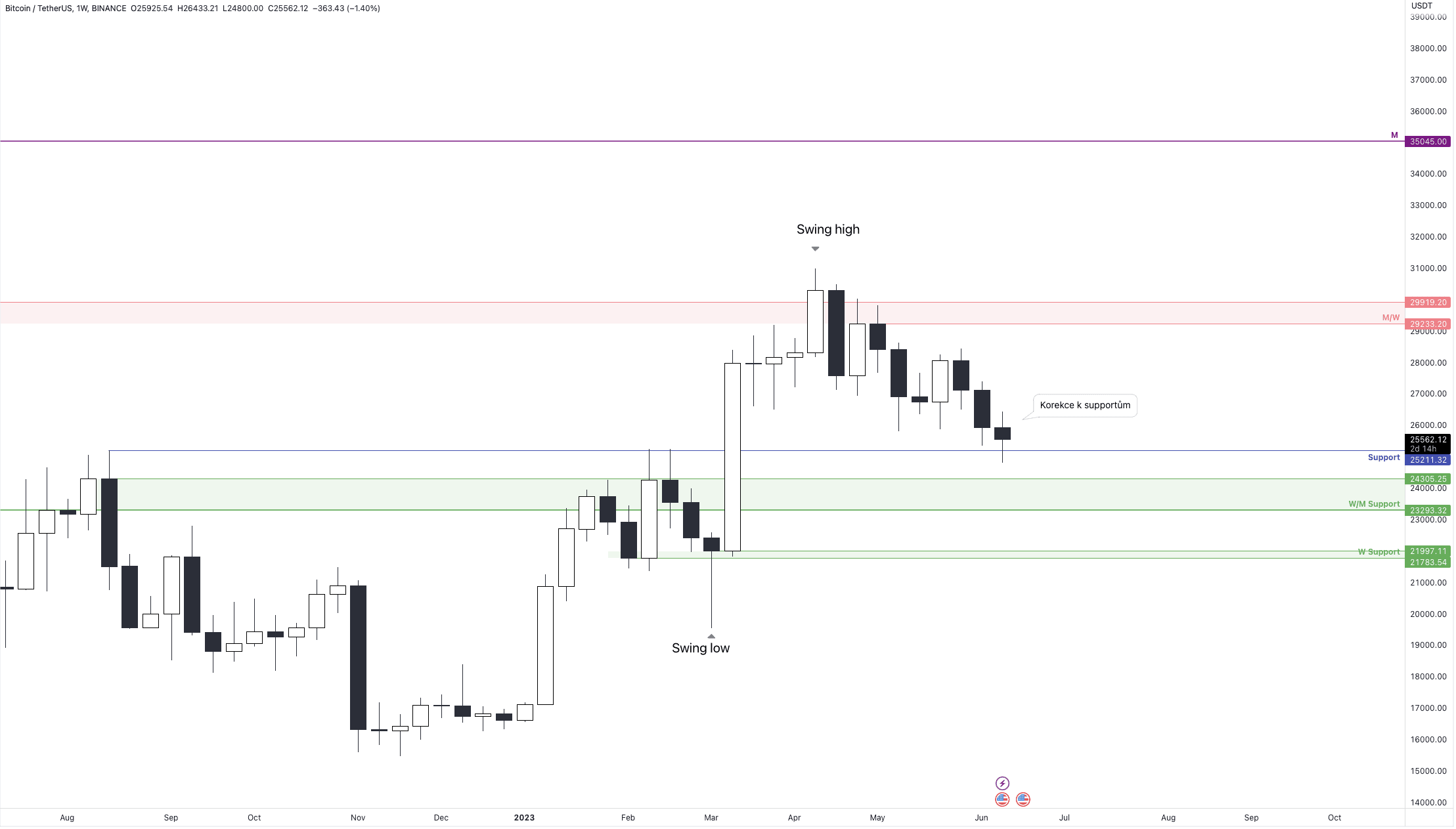 Z pohledu týdenních svící se stále nacházíme v hlavním uptrendu, kde se swing low nachází na cenové úrovni 20 tis. USD, swing high kolem 31 tis. USD a nyní probíhá korekce celého tohoto pohybu.