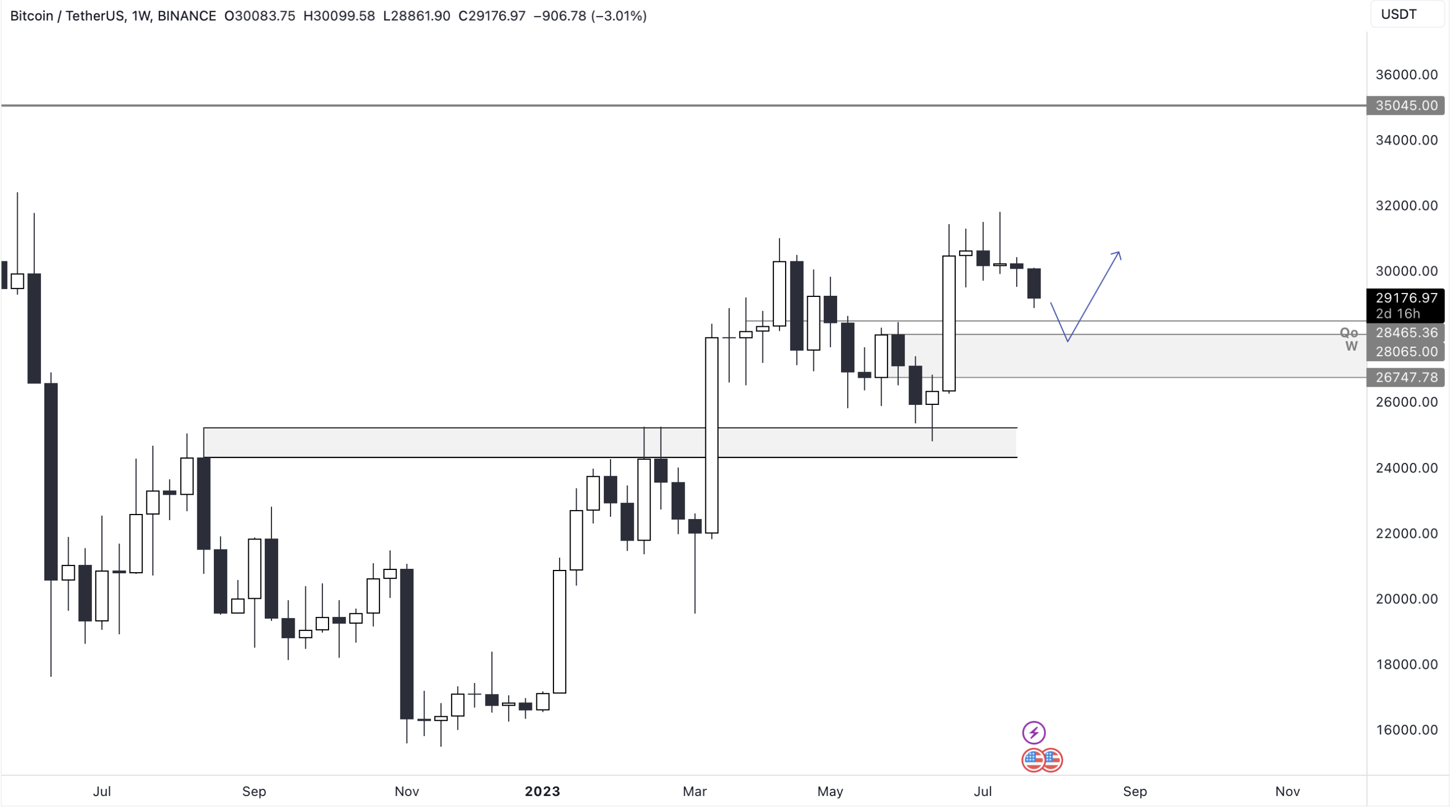 Bitcoin (BTC) na týdenním grafu nadále setrvává v uptrendu, který má zásadní swingové low na ceně 24 800 USD. Očekáváme tedy návštěvu supportů pod 29 tis. USD před pokračováním trendu vzhůru.
