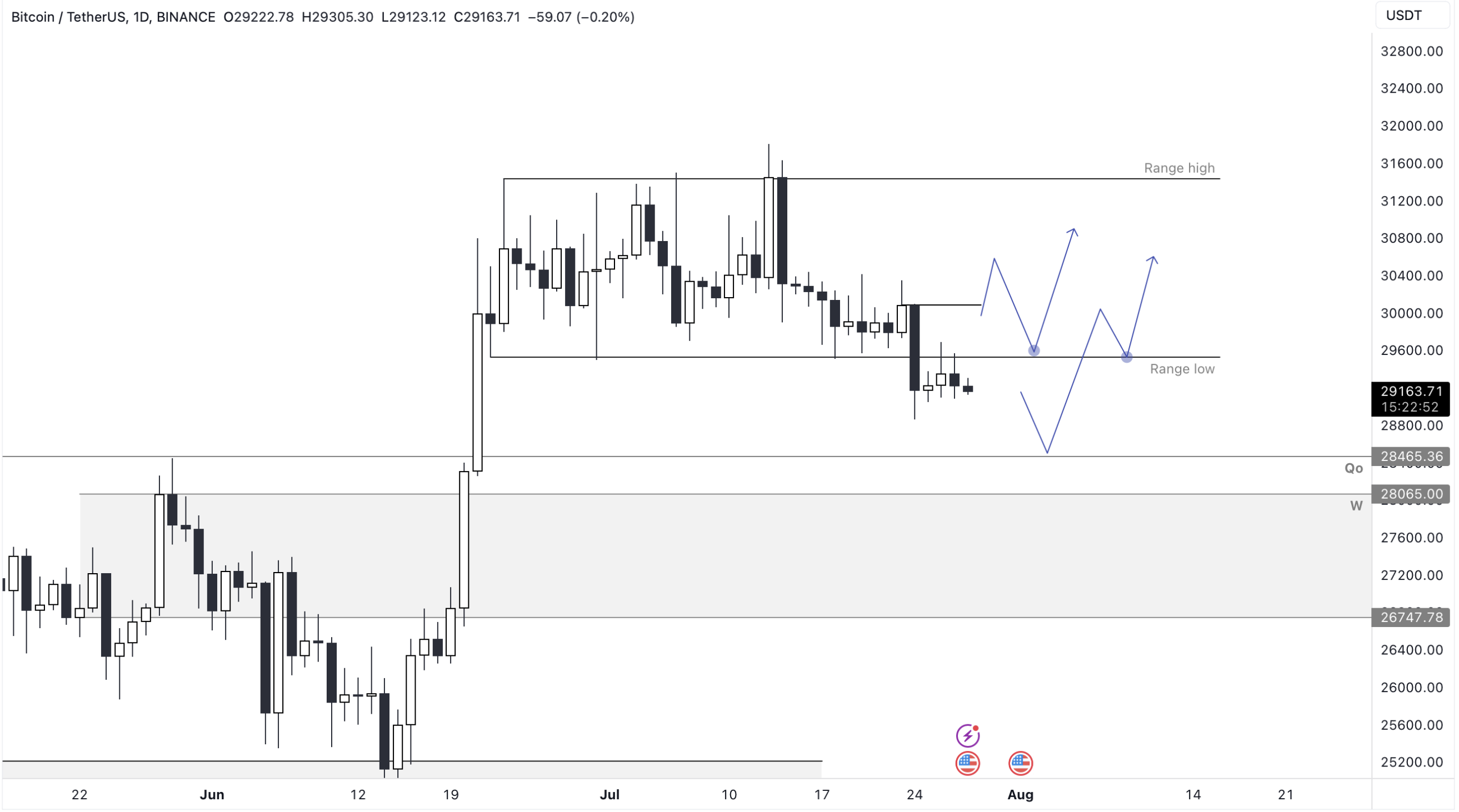 Primární scénář je tedy propad k 28 500 / 28 000 USD a poté začátek růstu. Bitcoin by mohl změnit tento pohyb, pokud by dokázal uzavřít denní svíci nad 30 100 USD. To by znamenalo již vytvořené dno.