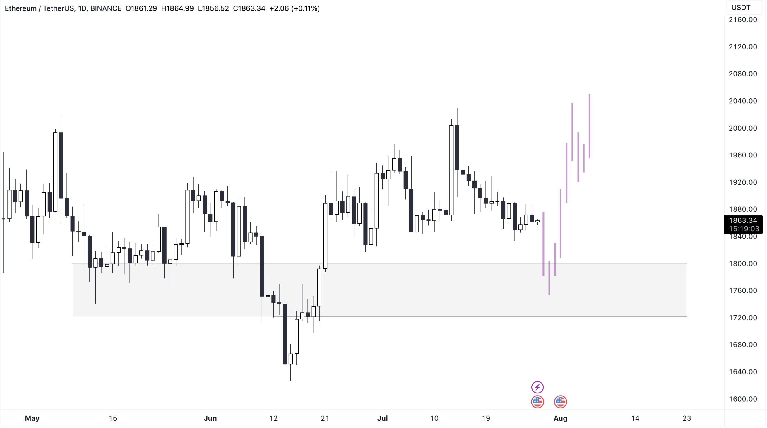 Ethereum (ETH) si za poslední týdny vybudovalo spoustu likvidity pod aktuální cenou. Je tedy pravděpodobné, že podobně jako na Bitcoinu uvidíme ještě jeden finální dip do úrovní mezi 1 800 až 1 700 USD, což považuji za optimální zónu, kde hledat long pozice.