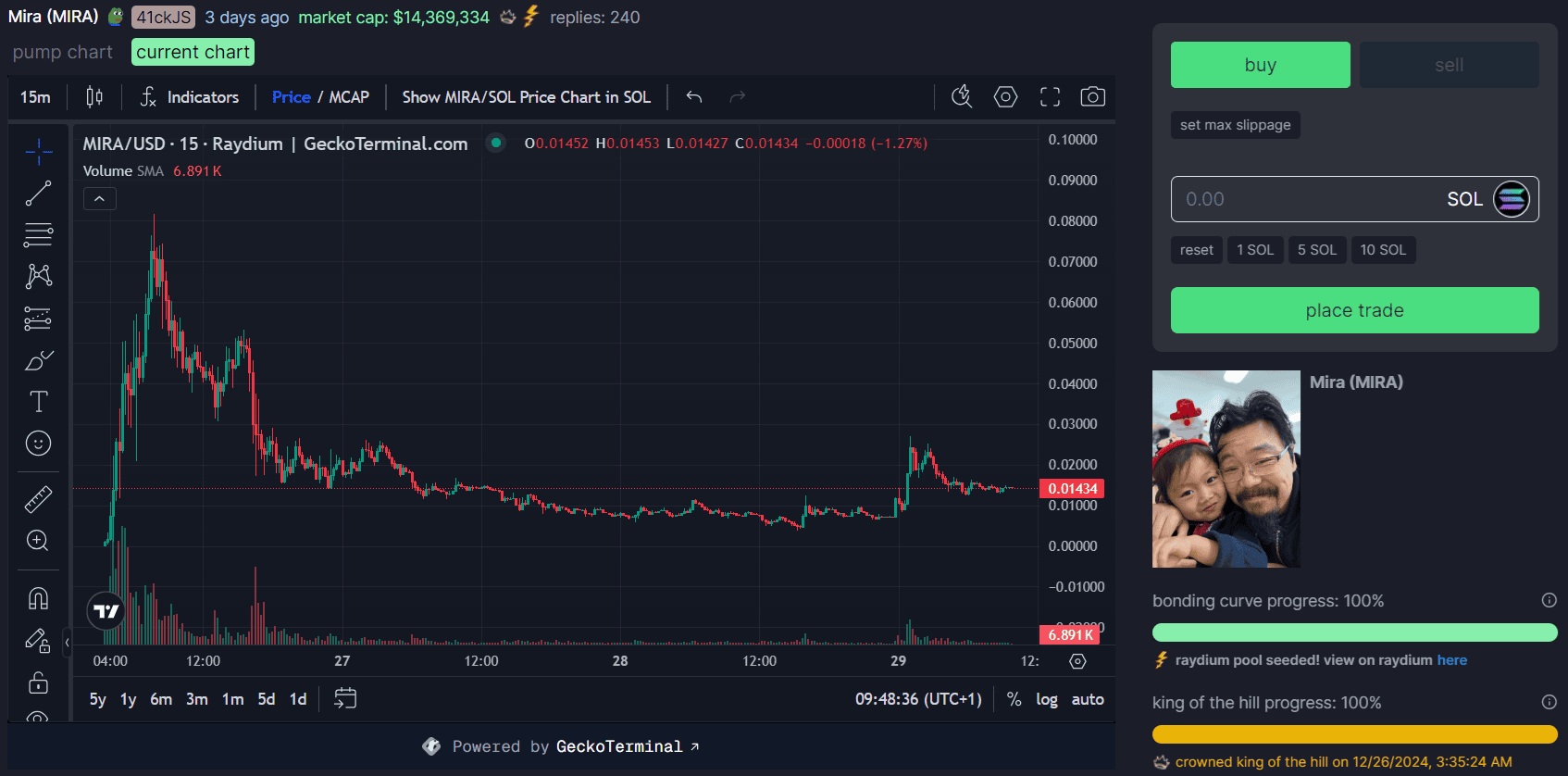 Otec dcery také zveřejnil ethereum, solana a bitcoin peněženku, čímž tak reagoval na poptávku svých sledujících. Zlom přišel ve chvíli, kdy náhodný uživatel na platformě pump.fun vytvořil MIRA token.