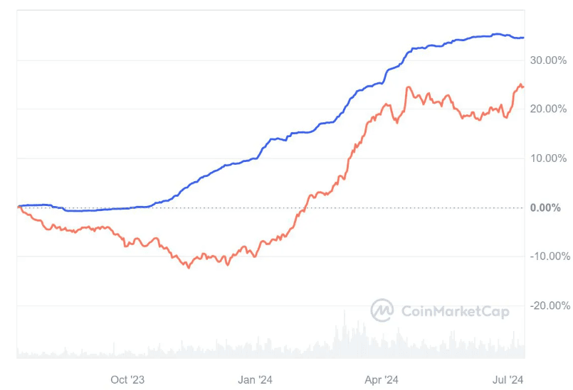 USDC (modrá linie) je stále více používaný již od června. Objem tokenů v oběhu je v rámci USDT (oranžová linie) přibližně stejný, zatímco nové USDC tokeny přibývají.