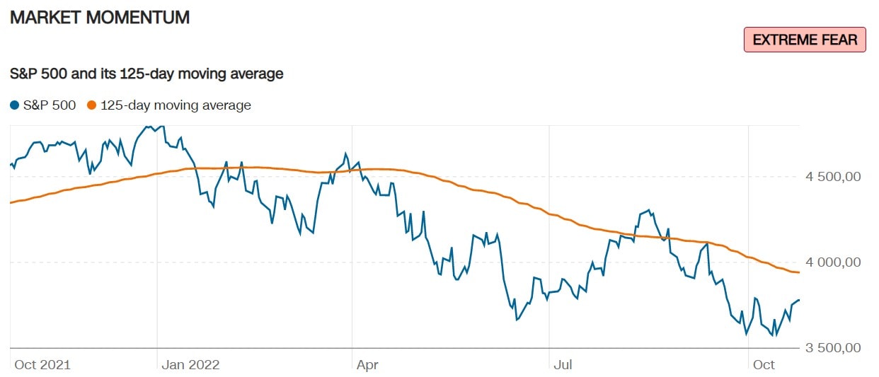 Index strachu a chamtivosti CNN v současné době signalizuje strach, což naznačuje, že investoři jsou poměrně pesimističtí ohledně vyhlídek amerického akciového trhu. Důvodů k obavám mají dost, protože vysoká inflace a rostoucí úrokové sazby hrozí, že americkou ekonomiku uvrhnou do recese. Kvůli těmto obavám se indexy S&P 500 a Nasdaq propadly do oblasti medvědího trhu a vymazaly tak majetek v hodnotě více než 9 bilionů dolarů.
