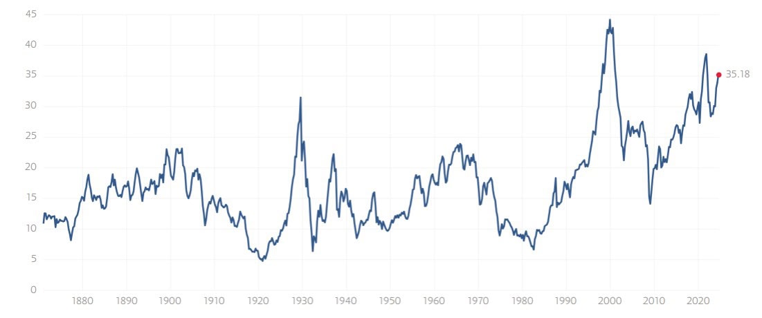 Shillerův poměr ceny k zisku (P/E) indexu S&P 500 Buffettovu opatrnost podporuje. S hodnotou 35,18, což je více než dvojnásobek 153letého průměru 17,16, se trh jeví jako nadhodnocený.