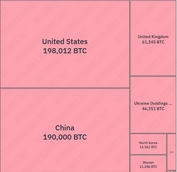 Největšími držiteli jsou Spojené státy s více než 198 000 BTC, Čína s přesně 190 000 BTC, Velká Británie s 61 245 BTC a Ukrajina držící 46 351 BTC.