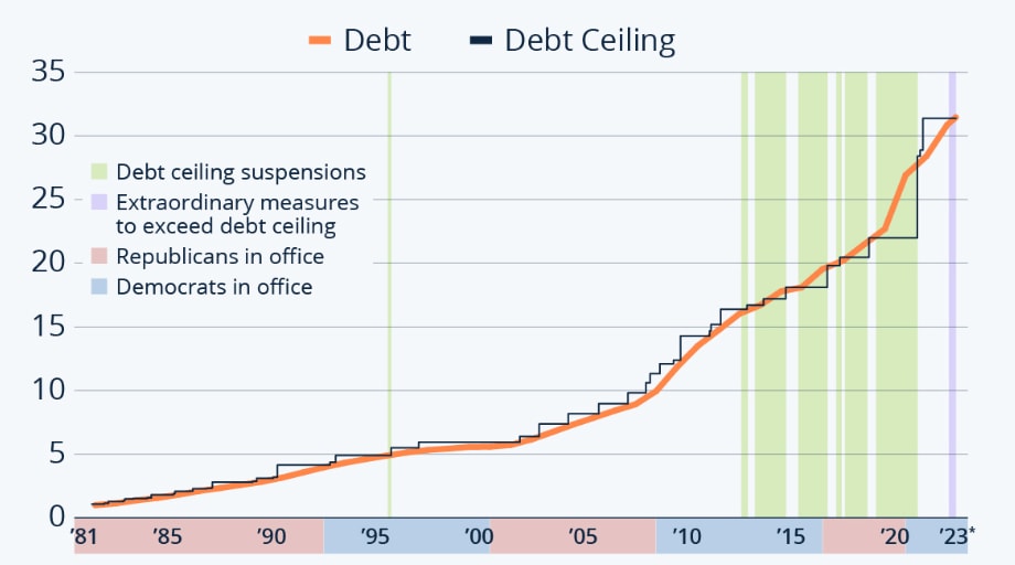 Vývoj výše zadlužení a dluhového stropu USA v bilionech dolarů od roku 1981
