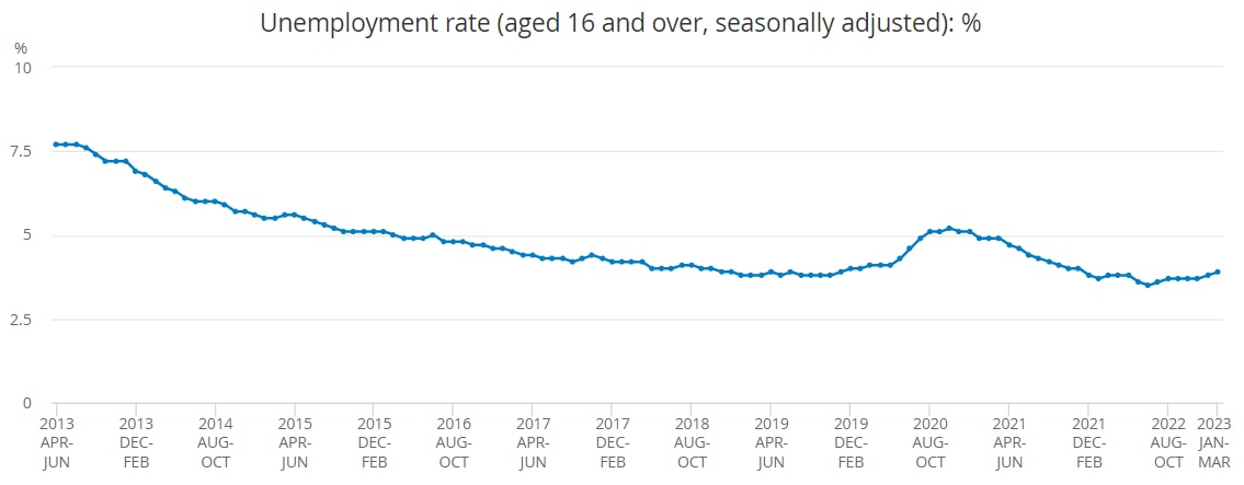 Mezitím se míra nezaměstnanosti ve Spojeném království za tři měsíce končící v březnu zvýšila na 3,9 % z 3,8 % oproti předcházejícímu období. Růst mezd však ve sledovaném období nevykazoval žádné známky zmírnění. Růst průměrné týdenní mzdy bez započtení prémií se oproti předchozímu roku zvýšil z 6,6 % na 6,7 %.
