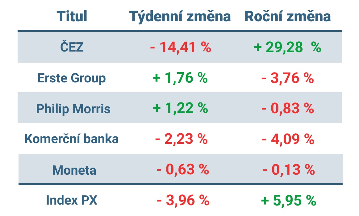 Pražská burza po všechny dny minulého týdne s výjimkou pátku padala. Index PX tak zakončil týdenní obchodování na hodnotě 1 316,8 bodu, čímž během týdne ztratil téměř 4 %. Nejvýraznější měrou se na propadu indexu PX podílely akcie ČEZ, které oslabily o více než 14 %. Akcie energetického giganta se zejména ve čtvrtek a v pátek propadaly kvůli nervozitě, kterou na trh přinesl návrh na změnu zákona o přeměně společností, který může vládě výrazně usnadnit prosazení rozdělení společnosti.