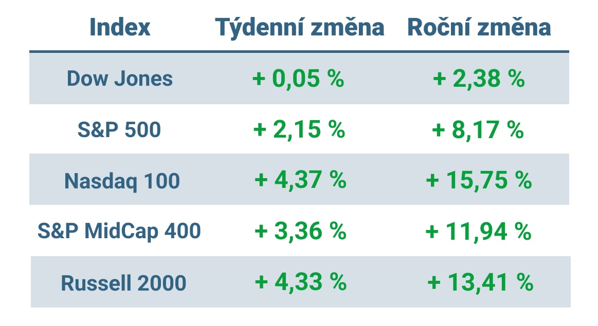 Tabulka ukazuje vývoj nejvýznamnějších amerických indexů v minulém týdnu a v roce 2023
