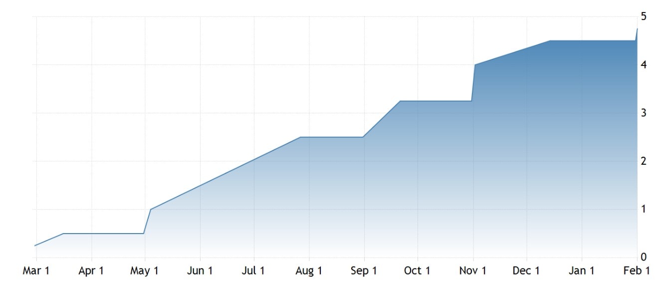 ECB zvýšila své klíčové úrokové sazby o půl procentního bodu, čímž depozitní sazba dosáhla 2,5 %. Centrální banka očekává, že v březnu zvýší sazby stejnou měrou kvůli základním inflačním tlakům. ECB dodala, že následně vyhodnotí další vývoj své měnové politiky, přičemž budoucí rozhodnutí budou nadále záviset na datech a budou se řídit individuálním přístupem.