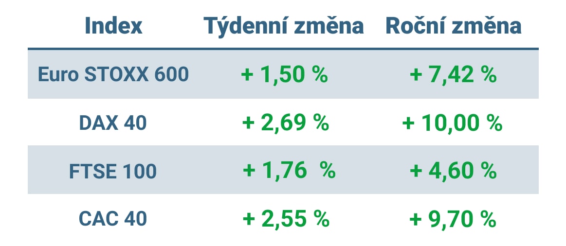 Akcie v Evropě vzrostly díky naději, že se centrální banky pravděpodobně blíží ke konci nejrestriktivnější fáze cyklu zpřísňování měnové politiky. Celoevropský index STOXX Europe 600 zakončil týden růstem o 1,50 %. Hlavní akciové indexy v jednotlivých zemích se pak rovněž posunuly vpřed. Německý index DAX přidal 2,69 % a francouzský index CAC 40 posílil o 2,55 %. Britský index FTSE 100 vzrostl o 1,76 %, částečně podpořen oslabením libry vůči americkému dolaru poté, co Bank of England (BoE) naznačila, že by úrokové sazby mohly dosáhnout vrcholu na nižší úrovni, než očekával trh.