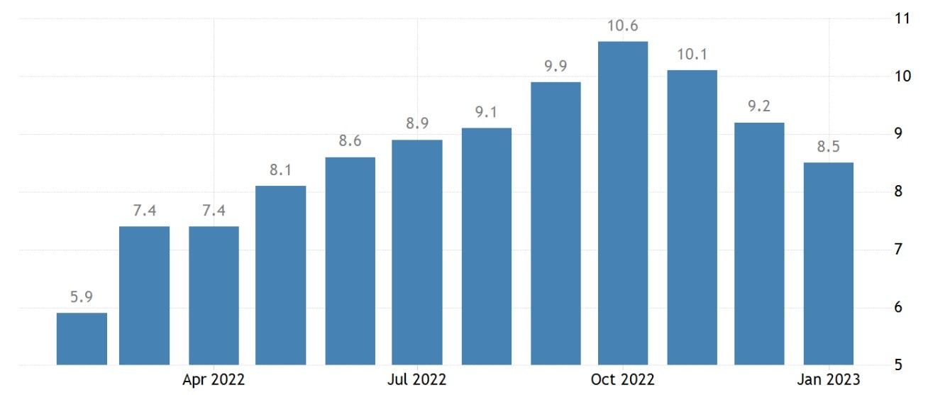 Nejnovější údaje ukázaly, že celková míra inflace v eurozóně v lednu ochladla více, než se očekávalo, na meziroční úroveň 8,5 % z 9,2 % v prosinci. Jádrová inflace bez započtení změn cen potravin a energií však zůstala na historicky nejvyšší úrovni 5,2 %. V posledních třech měsících roku 2022 také ekonomika eurozóny nečekaně vzrostla o 0,1 %.