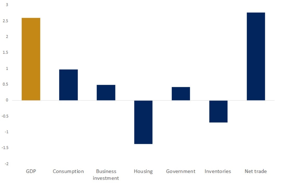 Graf ukazuje příspěvky k růstu HDP USA ve třetím čtvrtletí, přičemž čistý obchod podpořil růst, zatímco investice do bydlení prudce poklesly