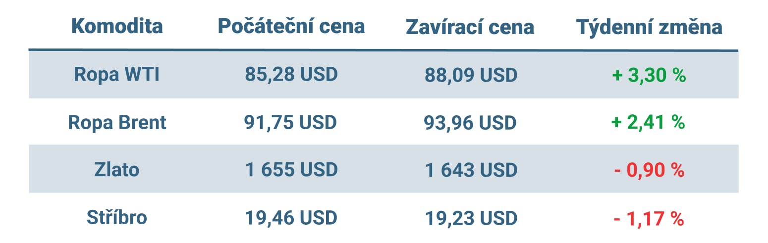 Vývoj hodnoty nejvýznamnějších komodit v minulém týdnu