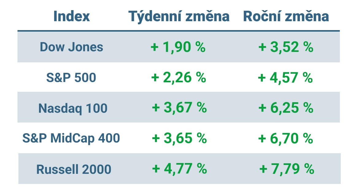 Tabulka ukazuje vývoj nejvýznamnějších amerických indexů v minulém týdnu a v roce 2023