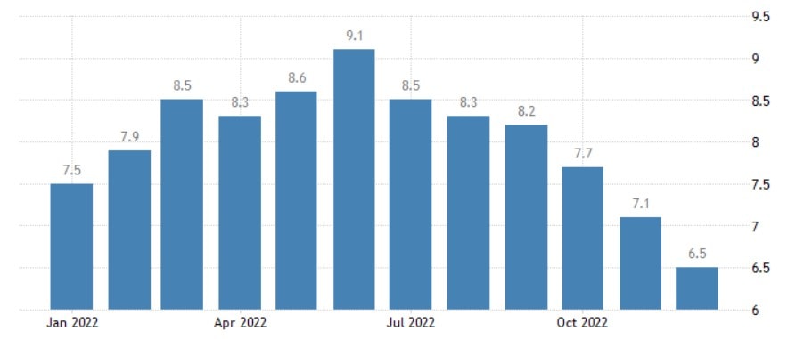 Celková inflace oproti předchozímu měsíci klesla o 0,1 %, k čemuž přispěl pokles cen energií a mírnější nárůst cen potravin. V meziročním srovnání se index spotřebitelských cen zvýšil o 6,5 % a zpomalil tak z listopadového tempa 7,1 %. Po vyloučení potravin a energií se jádrové spotřebitelské ceny minulý měsíc zvýšily o 0,3 % a v meziročním srovnání o 5,7 %, což je téměř o celý procentní bod méně než jejich zářijové maximum.