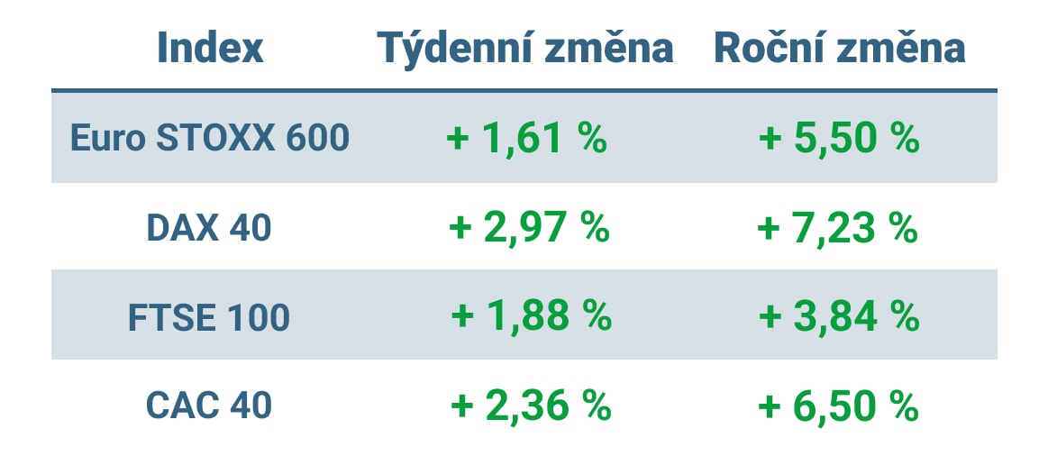 Akcie v Evropě rostly druhý týden po sobě, protože lepší než očekávané ekonomické údaje zvýšily naději na krátkou a mělkou recesi. Někteří centrální bankéři však uvedli, že úrokové sazby bude nutné dále zvyšovat, což zmírnilo optimismus trhu. Celoevropský index STOXX Europe 600 zakončil týden o 1,61 % výše. Hlavní akciové indexy v nejvýznamnějších evropských ekonomikách rovněž výrazně rostly. Německý index DAX vzrostl o 2,97 %, francouzský index CAC 40 přidal 2,36 % a britský index FTSE 100 si připsal 1,88 %.