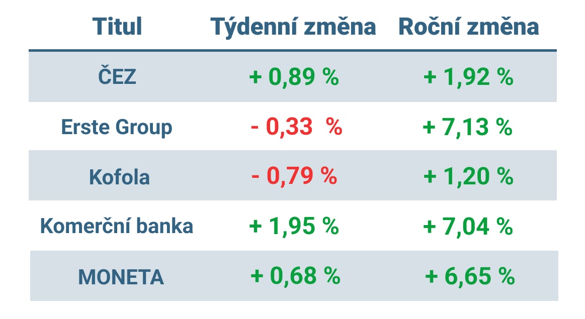 Vývoj ceny nejvýznamnějších titulů obchodovaných na pražské burze v minulém týdnu a od začátku roku 2023