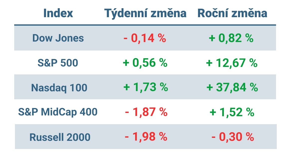 Hlavní americké indexy uzavřely týden smíšeně po dalším týdnu obchodování, v němž růstové akcie s velkou kapitalizací – a zejména mega-caps akcie informačních technologií – výrazně překonaly zbytek trhu.