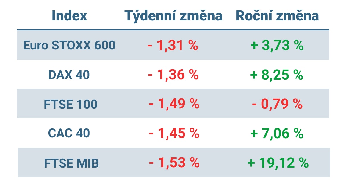 Tabulka ukazuje vývoj nejvýznamnějších evropských indexů v tomto týdnu a roce 2023