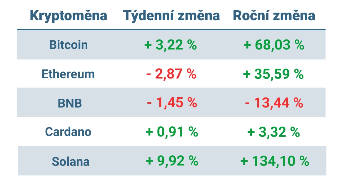 Vývoj ceny nejvýznamnějších kryptoměn za posledních 7 dní a od začátku roku