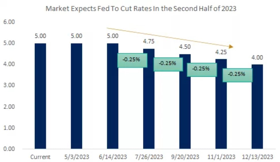 Celkově lze říci, že jak bankovní krize, tak nedávné zasedání Fedu vyvolaly posun v očekávání trhu ohledně dalšího zvyšování sazeb. Trhy v současné době nepředpokládají další zvyšování sazeb a očekávají, že Fed začne snižovat sazby již na červencovém zasedání. Ve skutečnosti se nyní počítá se čtyřmi sníženími sazeb pro rok 2023, což by vedlo k poklesu sazby federálních fondů na úroveň kolem 4,0 %, což je výrazně pod úrovní 5,1 %, kterou FOMC uvedl na březnovém zasedání jako cílovou. Fed se zcela jistě blíží ke konci svého cyklu zpřísňování, prostor pro snížení sazeb se však hledá těžko, zejména kvůli tomu, že je inflace zvýšená a trh práce zůstává napjatý. Fed s největší pravděpodobností sníží sazby nebo naznačí jejich snížení, až uvidí, že se inflace významně přiblíží jeho 2% cíli, nebo uvidí, že ekonomika a trh práce prudce oslabují, přičemž ani jedno z toho dnes není na místě.