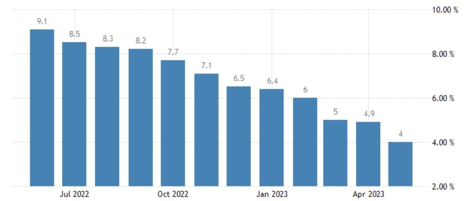 Zdá se, že v pátek zveřejněné údaje o inflaci výrazně podpořily sentiment. Míra inflace v květnu oproti dubnu klesla o 0,9 % na 4 %. Jádrová inflace (bez potravin a energií), která je považována za preferovaný ukazatel inflace Federálního rezervního systému, se na meziroční bázi snížila na 4,6 %. To je stále výrazně nad 2% cílem Fedu, ale zřejmě pominuly obavy z opětovného zrychlení cenových tlaků po dubnovém proinflačním překvapení.