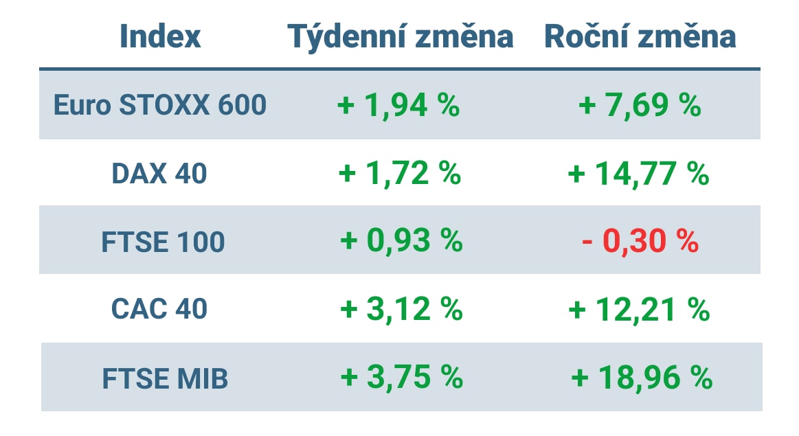 Tabulka ukazuje vývoj nejvýznamnějších evropských indexů v tomto týdnu a roce 2023