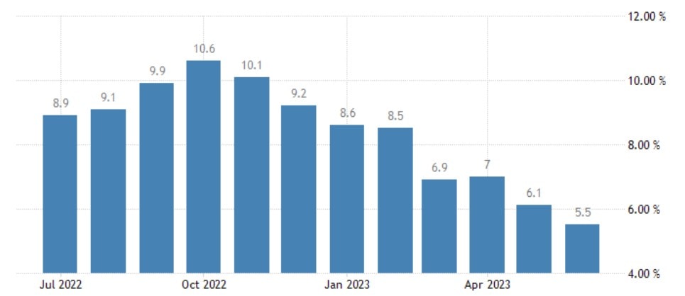 Podle předběžného odhadu statistického úřadu Evropské unie meziroční inflace v eurozóně v červnu již třetí měsíc zpomalila na 5,5 % z květnových 6,1 %. Výsledek byl nižší než prognóza ekonomů, kteří předpokládali 5,6 %. Jádrová inflace se však zvýšila z 5,3 % na 5,4 %.
