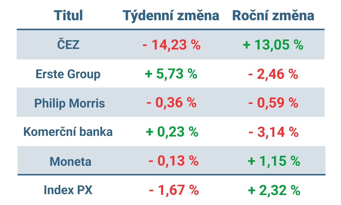Ve čtvrtek došlo k výraznému poklesu hodnoty akcií energetické společnosti ČEZ. Akcie tohoto podniku se propadly o 13 procent, čímž jejich cena klesla na hodnotu přibližně 880 korun. Tento pokles byl způsoben tím, že ve čtvrtek byly akcie společnosti poprvé prodávány bez možnosti inkasovat rekordní dividendu ve výši 145 korun za akcii. Týdenní obchodování nakonec akcie ČEZ zakončily na hodnotě 892 korun. Tento propad nakonec vedl i k týdennímu oslabení indexu PX, který odepsal 1,67 % své hodnoty. Z dalších významných titulů pražské burzy se výrazně dařilo akciím Erste Group, které si naopak téměř 6 % připsaly. Ostatní tituly se obchodovaly téměř beze změny.