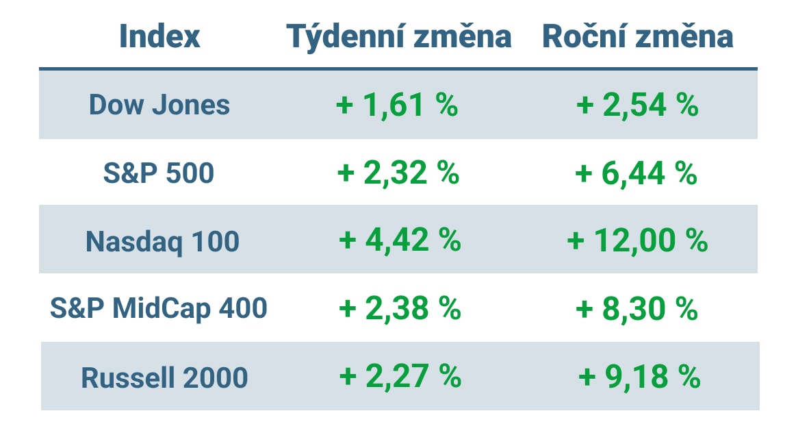 Tabulka ukazuje vývoj nejvýznamnějších amerických indexů v minulém týdnu a v roce 2023