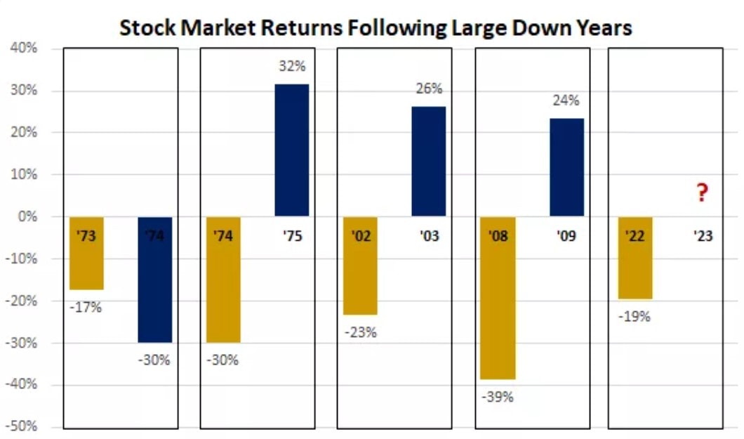 V roce 2022 poklesl index S&P 500 o 19,4 % (bez započtení dividend). Od roku 1950 byly zaznamenány čtyři kalendářní roky, kdy akciový trh klesl o více než 15 %. V následujícím roce trh v průměru vzrostl o 12,9 %.
