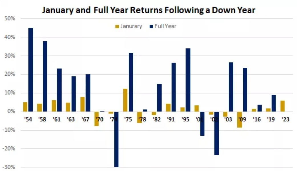 Ze čtyř předchozích let s více než 15% poklesem tři začaly dalším poklesem v lednu, což naznačuje, že rok s výrazným oslabením se ne vždy posunul s otočením kalendáře. Pokud se však podíváme šířeji na všechny léta od roku 1950, kdy akciový trh za celý rok klesl, leden následujícího roku měl průměrný výnos 1,3 %, což je o něco lepší než průměrný výnos 1 % za všechny ledny.